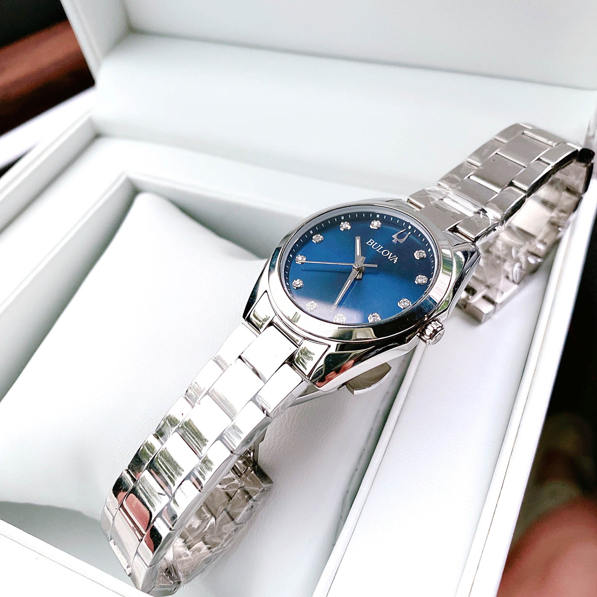 The Bulova Surveyor brings refined elegance to women's watchmaking with a polished stainless steel case and striking blue dial. Eleven hand-set diamonds accent the dial with understated luxury, while the sporty design maintains practical functionality for everyday wear. This timepiece balances feminine sophistication with athletic versatility, making it a distinguished addition to any watch collection.