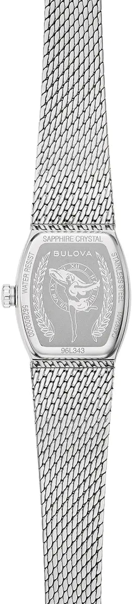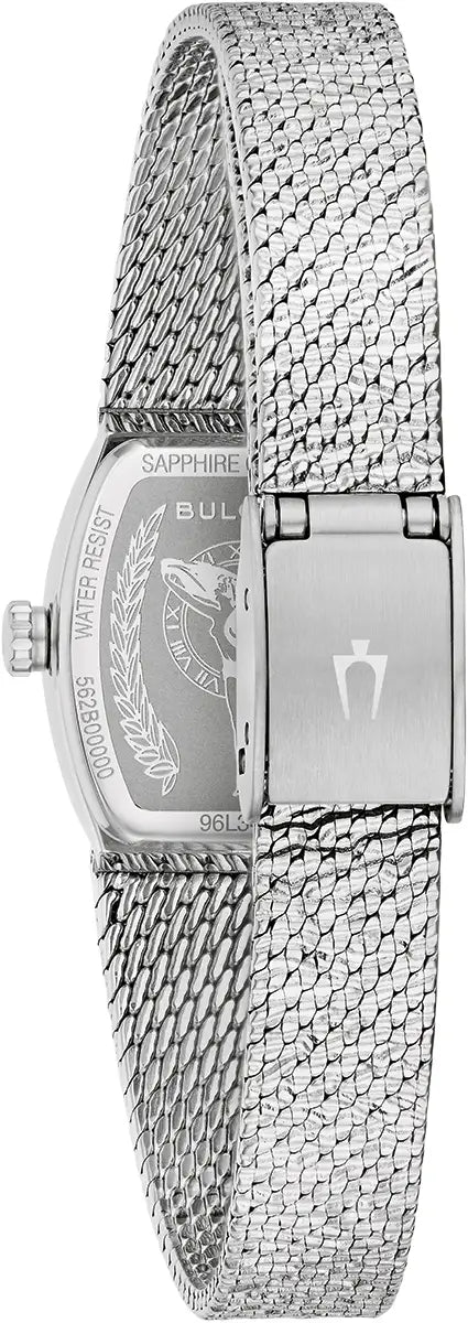 Capture the elegance of the 1970s with the Bulova Classic “Goddess of Time” watch. Featuring a silver-tone stainless steel tonneau case with a textured mesh bracelet, each unique blue sodalite stone dial is complemented by silver markers and hands. The finely etched Goddess of Time on the case back adds a touch of timeless sophistication to this exquisite ladies’ timepiece.