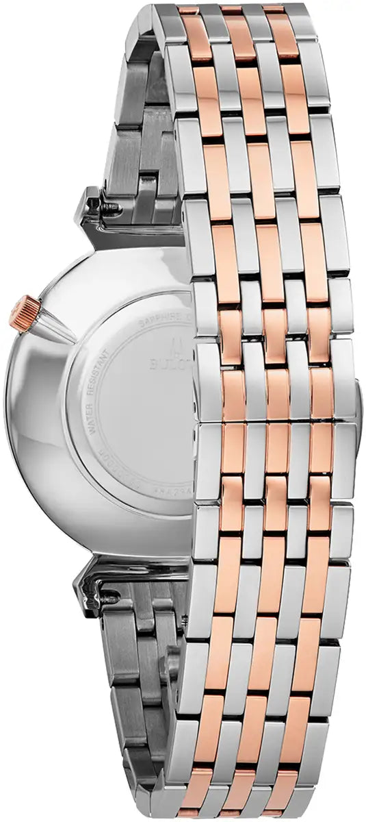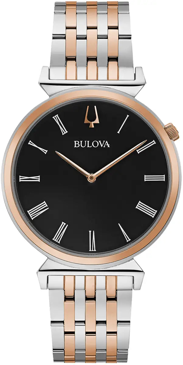 Inspired by Bulova's heritage timepieces, the rose gold-tone Regatta from the Classic Collection combines timeless elegance with refined details. It features slim Roman numeral markers on a sleek black dial, a distinctive crown positioned at 2 o’clock, and unique angled lugs that enhance its sophisticated silhouette. The flat sapphire crystal protects a slim quartz movement, while water resistance up to 30 metres ensures durability for everyday wear. Perfect for those who appreciate classic design with a modern twist.
