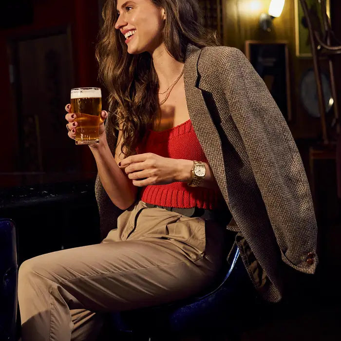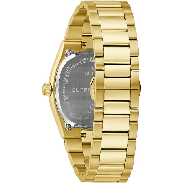 Drawing inspiration from the incredible Bulova Super Seville Day-Date from the 1970s, the new Super Seville merges retro aesthetics with state-of-the-art Precisionist technology for a timeless modern appeal. The gold-tone stainless steel 38mm case has the versatility to suit all styles and makes a bold statement with a seamless silhouette created by the retro TV-shaped case transitioning into the integrated 3-link gold-tone stainless steel bracelet, which features a secure and convenient push-button deployment clasp. An elegant, grooved coin edge bezel enhances the case and surrounds the flat sapphire crystal and its date magnifier. The sophisticated vertical brushed dial is silver-white with polished hands and indices and a date situated perfectly at 3 o’clock. The new Super Seville is powered by our proprietary high precision quartz Precisionist movement, a revolutionary 8-jewel quartz mechanism vibrating at a remarkable 262kHz, accurate to seconds per year with increased resistance to temperature changes, and with a smooth sweeping second hand. Embrace an effortless kind of elegance with the men’s Bulova Super Seville.