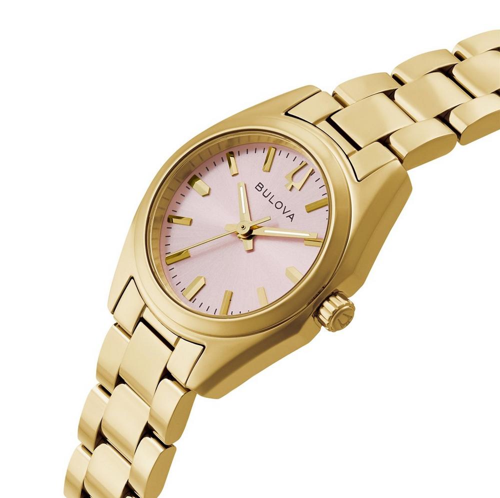 The Bulova Surveyor ladies' watch combines refined luxury and modern style in a compact 23mm gold-tone stainless steel case. Its polished and brushed finishes, sapphire crystal, and sunburst pink dial with luminescent hands offer elegant sophistication. Equipped with a matching 3-link bracelet and secure clasp, this timepiece is the perfect everyday accessory for those who appreciate timeless quality and graceful design.