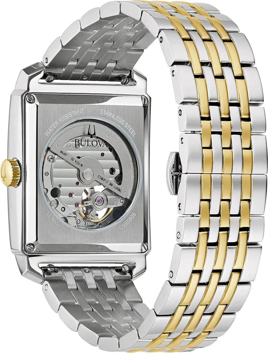 From the Sutton Collection, this elegant timepiece features a two-tone rectangular stainless steel case and bracelet, accented by a gold-tone frame and curved mineral crystal. Its textured silver-white dial showcases gold-tone Arabic numerals and hands, while a 7 o’clock aperture reveals the 21-jewel mechanical movement with a 42-hour power reserve. Combining refined design with reliable craftsmanship, this Bulova watch offers a sophisticated statement for the discerning wearer.