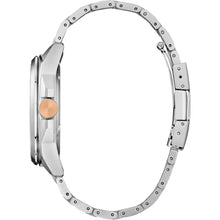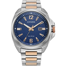 - Silver-tone stainless steel case with a blue 3-hand dial with a date window, rose gold-tone accents and sapphire crystal