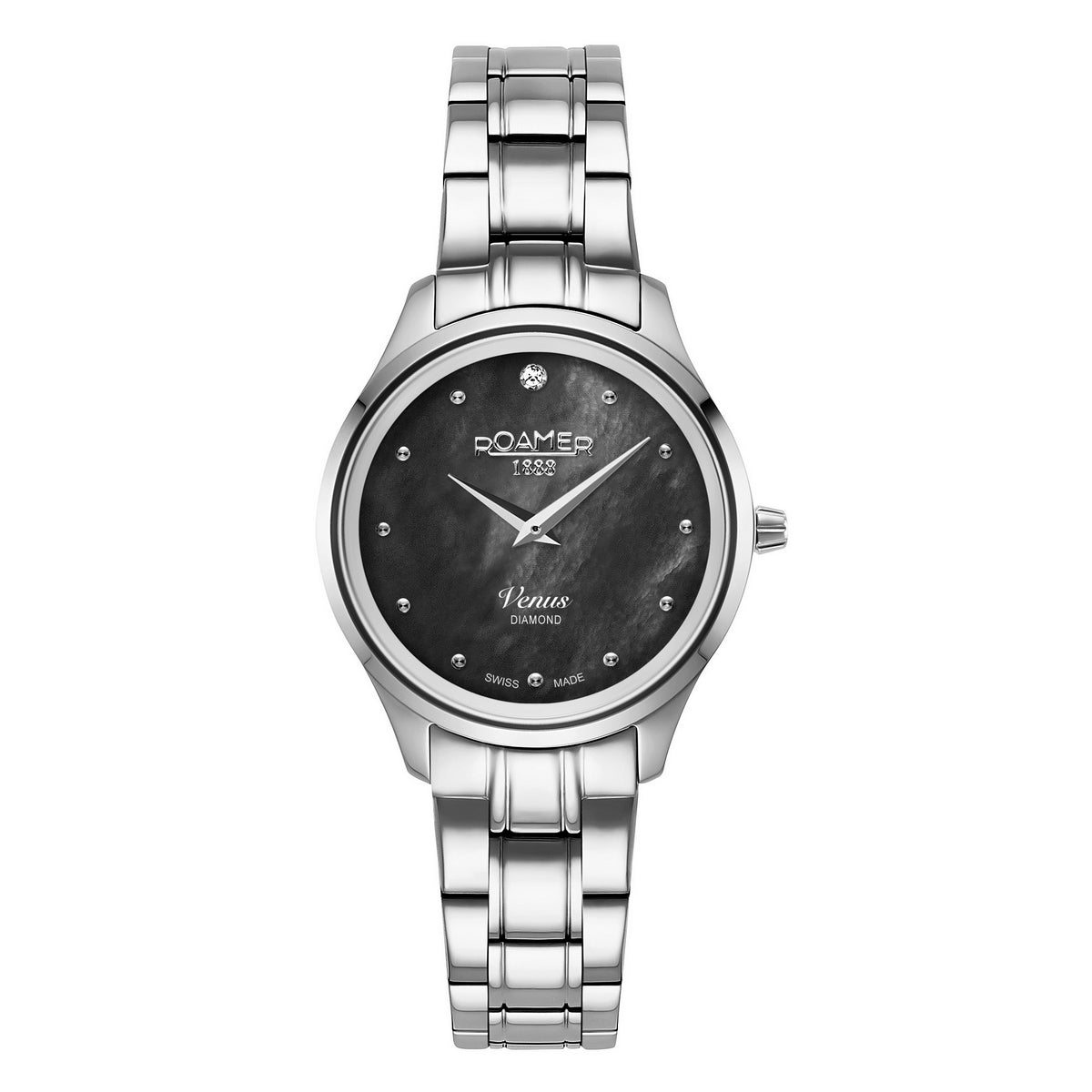 MOVEMENT TYPE: Quartz MOVEMENT CALIBRE: Ronda 762 BAND TYPE: Stainless Steel Bracelet CLASP TYPE: Deployment DIAL COLOUR: Mother of Pearl WATER RESISTANCE (Metres): 50 CASE WIDTH: 30mm CASE DEPTH: 6mm GLASS TYPE: Sapphire Crystal DATE FUNCTION: STONE TYPE: Diamond