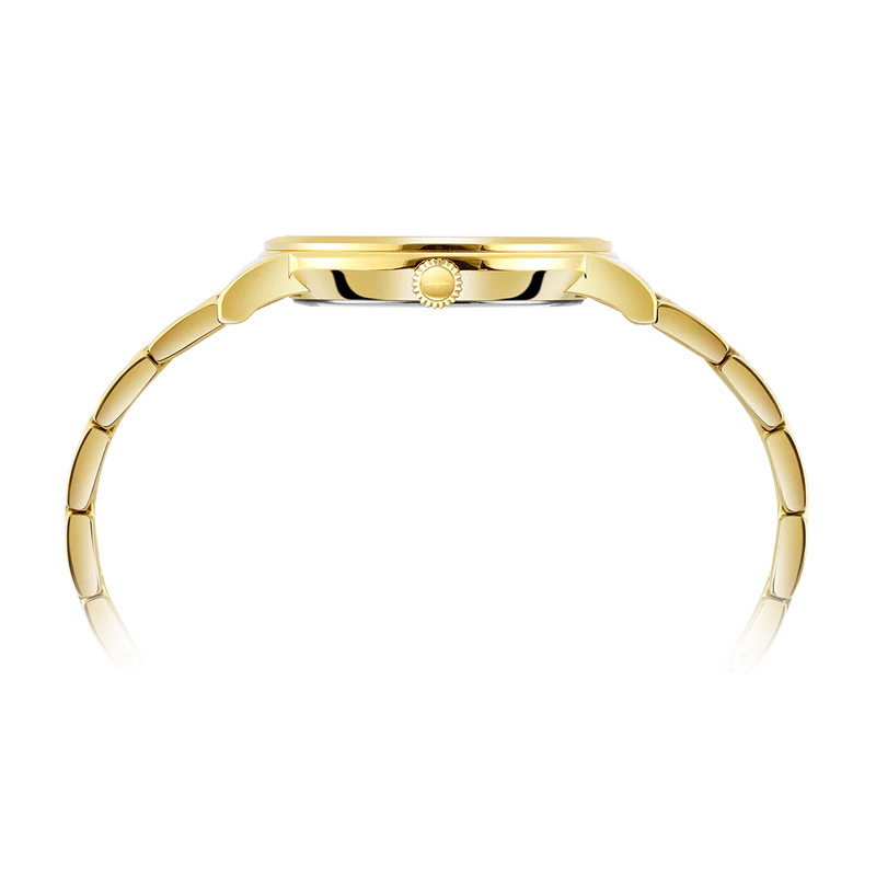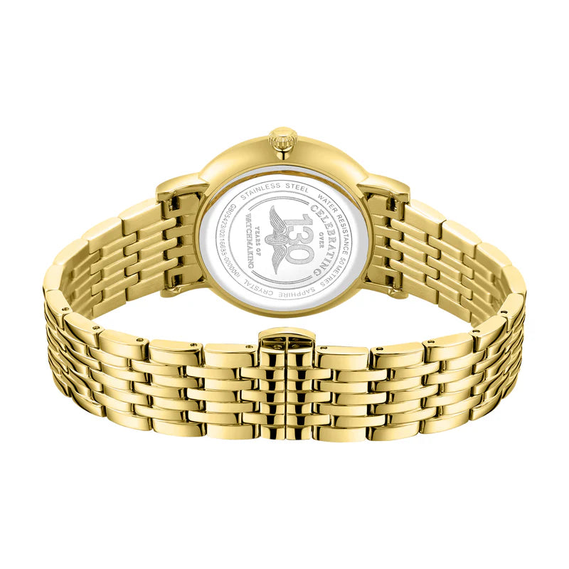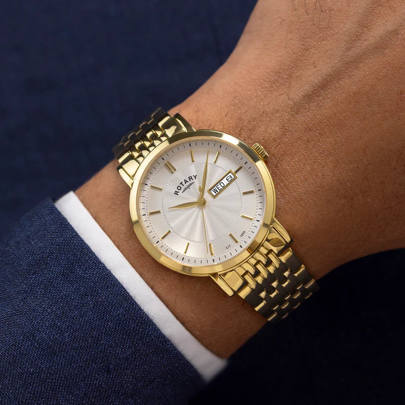 Expertly crafted with gold PVD stainless steel and sapphire glass, this Rotary Gent’s Dress Watch combines sophistication with precision. Its 37mm case houses a white guilloche dial accented by applied indices and detailed radial and outer dial stitching. Powered by reliable quartz movement, it includes a practical day/date window. The 7-link tapered bracelet with deployment clasp ensures comfort and style, while 100-meter water resistance provides robust durability for everyday wear. This timepiece expertly complements formal attire with classic elegance.