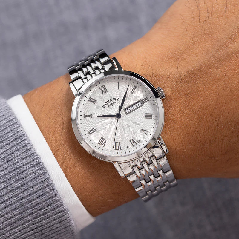 The Rotary Gent’s Steel Dress Watch combines classic design with precise functionality. Its 37mm stainless steel case and slim 7.2mm profile house a silver dial detailed with applied Roman numeral markers, black sword hands, and a contrasting black minute track for enhanced legibility. The day/date window at 3 o’clock adds essential practicality. Powered by quartz movement and protected by sapphire glass, this timepiece features a polished 7-link tapered bracelet and offers 50 meters water resistance, making it a sophisticated choice for refined everyday wear.