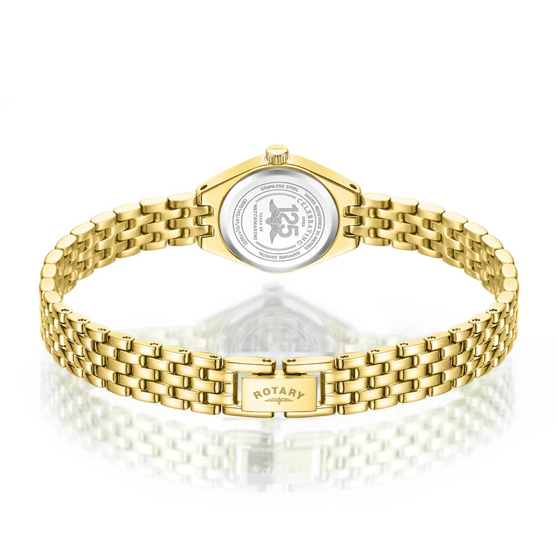 The Rotary Traditional Cocktail Watch is a refined ladies' timepiece featuring a petite 20mm case and a luminous mother of pearl dial. Diamonds set on the dial add a sparkling touch of luxury, while the gold Roman numerals and hands enhance classic elegance. Protected by sapphire glass and water-resistant up to 30 meters, this watch combines delicate design with durable craftsmanship. Perfect for sophisticated occasions, it embodies timeless style and subtle glamour. Please note, this model is no longer available for purchase from Rotary.