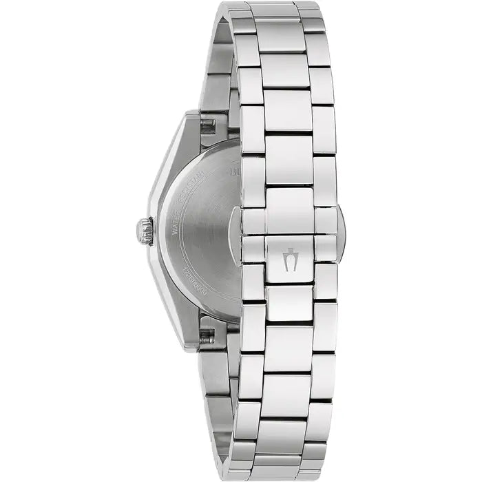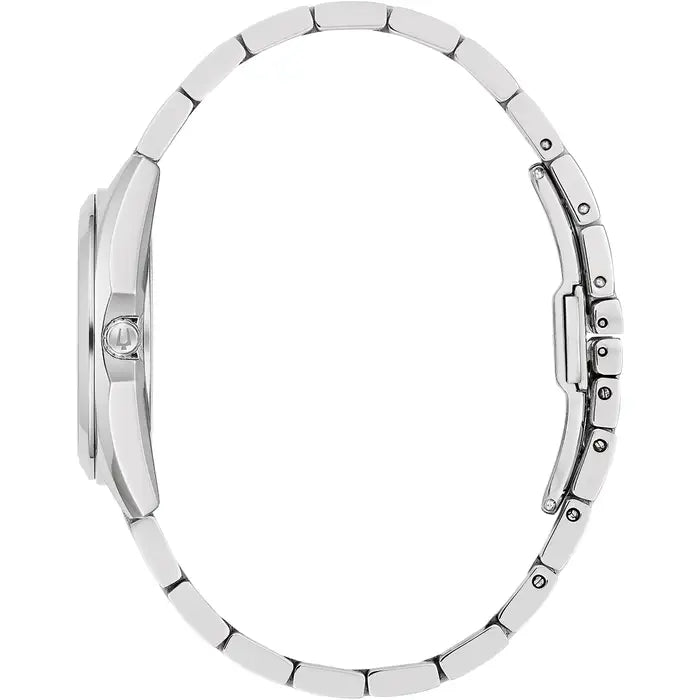 The Bulova Diamond Set 'Surveyor Collection' watch combines sporty elegance with refined craftsmanship. Crafted in stainless steel, it features a white mother-of-pearl dial adorned with 11 hand-set diamonds, adding a subtle yet luxurious touch. This sophisticated timepiece is detailed with precision, making it a distinguished accessory that enhances any collection with grace and style.